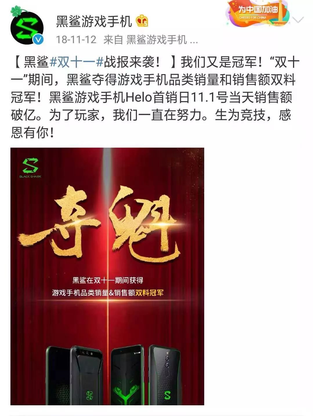 如今事实已经证明黑鲨科技的成功:2018年4月20日,首款黑鲨游戏手机发售后瞬间售罄;当年“双11”期间,黑鲨游戏手机Helo实现当天销售额破亿;公司刚起步一年,其产品在游戏垂直市场占有率达到63.7%,超过Razer Phone、华硕ROG、nubia红魔等竞争对手。