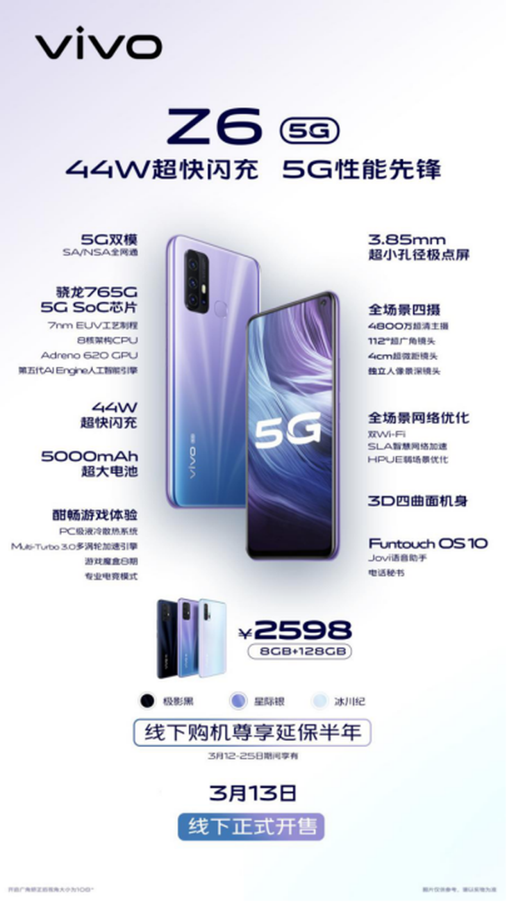 ·3月13日5G性能先锋vivo Z6 在线下渠道正式开售,8G+128G版本售价仅2598元 ·搭载骁龙765G芯片,支持双模5G全网通,采用44W超快闪充和5000mAh大电池组合,带来持久畅快的5G体验 ·线下渠道防护措施全面升级,用户购机更安心