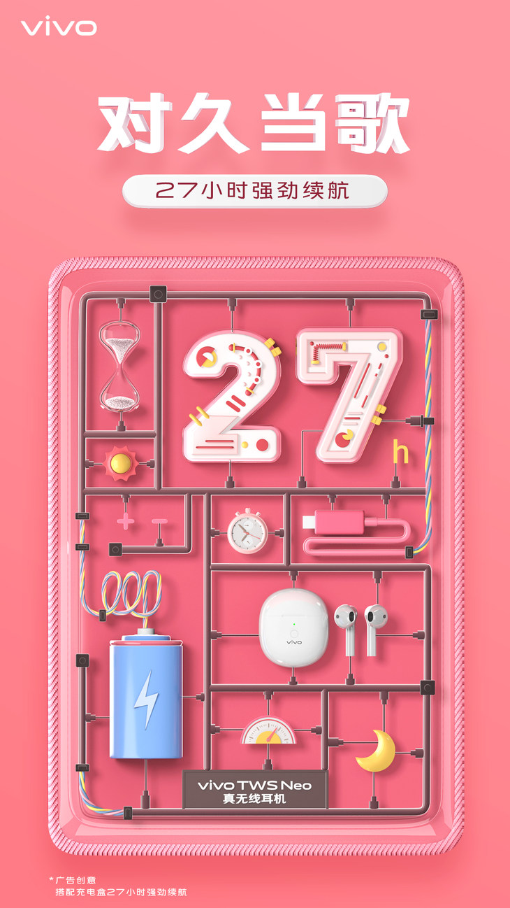 · vivo TWS Neo在电源管理方面软硬兼施,最大支持27小时强劲续航; · vivo TWS Neo真无线耳机单机播放时长5.5小时,可看完两部电影; · vivo TWS Neo持续热销中,与X50、iQOO 3、NEX 3、S6可享优惠套餐;