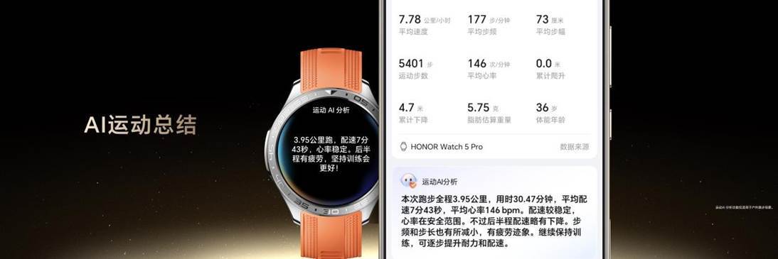 运动后,荣耀手表5 Pro可以自动生成AI跑步运动总结,汇总各项运动参数可视化呈现的同时,还提供针对性的专业跑步运动改善建议,实现科学化AI全程训练陪伴。
